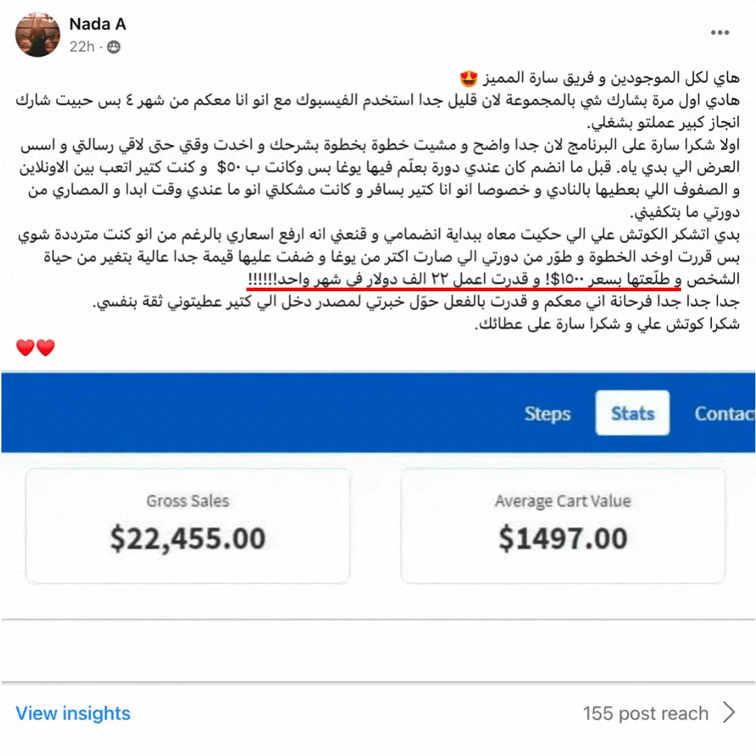 بالاضافة الى تحقيقها لأكثر من مليونين دولار في عملها خلال سنة ال ٢٠٢٢ و هي أول امرأة عربية تحصل على درع المليون دولار من منصة كليك فانلز. خبرتها في مجال إطلاق الدورات الأونلاين وتسويقها سمحت لها بخلق نظام أوتوماتيكي يؤدي إلى تحقيق الدخل بفعالية أكبر وهذا النظام نفسه التي تقوم بمشاركته وتطبيقه مع عملائها وطلابها.